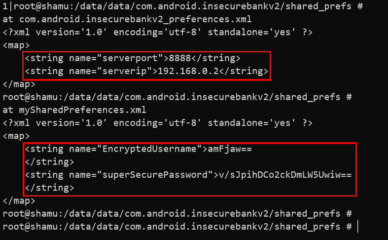 com.android.insecurebankv2_preferences.xml 파일에는 serverport와 serverip가 각각 평문으로 저장되어있고, mySharedPreferences.xml에는 EncryptedUsername과 superSecurePassword로 각각 암호화된 유저네임과 슈퍼시큐어한패스워드가 저장되어있는데 ==로 끝나는 것으로 보아선 base64 암호화이다.