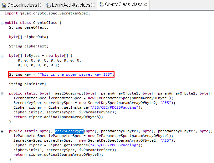 aesEncryptedString이 구현된 클래스로 가보자. 대칭키가 하드코딩 되어있다.
