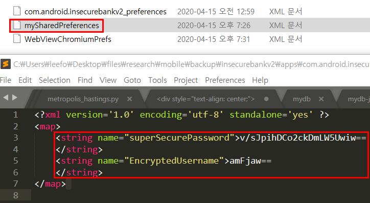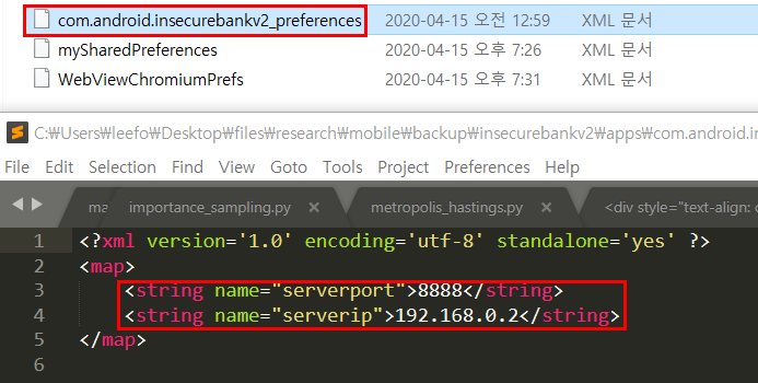 생성된 tar 파일을 살펴보면, apps\com.android.insecurebankv2\sp 폴더에 3개의 xml 파일이 있다. 아래와 같이 com.android.insecurebankv2_preferences.xml 파일에서 평문의 서버포트와 IP 정보를 확인할 수 있다.