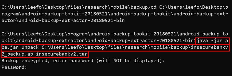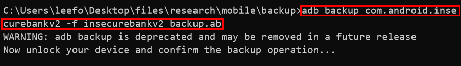 > adb backup com.android.insecurebankv2 -f insecurebankv2_backup.ab