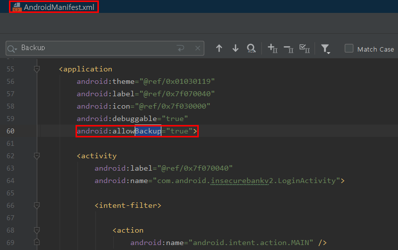 인시큐어뱅크(InsecureBankv2) 앱의 경우 AndroidManifrest.xml에 다음과 같이 allowBackup 값이 true로 설정되어있기 때문에 전체 백업이 가능하다.