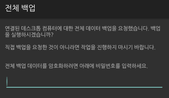 그러면 아래와 같이 인시큐어뱅크앱에서 전체 백업을 진행할 것인지 여부를 묻는다. 패스워드를 입력한 후 전체백업을 진행한다.