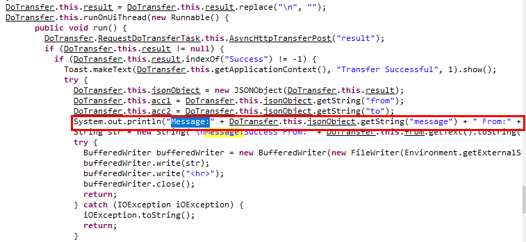 DoTransfer는 System.out.println을 사용해 계좌정보를 평문으로 콘솔 출력하고 있다.