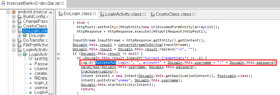 DoLogin 클래스를 확인해보면, 암호화되기 전의 유저네임과 패스워드가 로그로 기록되는 부분을 볼 수 있다. Log.d의 d는 로그 레벨로 Debug를 의미하며 Log.d의 첫번째 인자는 tag이고 두번째 인자가 로그로 출력될 메시지이다.