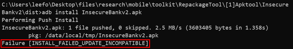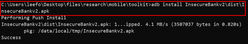 > adb install InsecureBankv2\dist\InsecureBankv2.apk