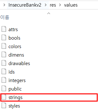 그러면 apktool 이 위치한 곳에 디컴파일된 인시큐어뱅크 폴더가 생성된다. 해당 폴더를 살펴보면, 아래와 같이 3개의 폴더와 2개의 파일로 이루어져 있다. 이 중 리소스 폴더인 것으로 추측되는 res 폴더를 살펴본다.