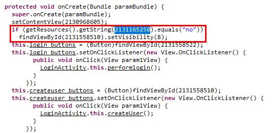 그리고 JD-GUI도 전체 검색이 안되어 슬슬 불편해지기 시작했다. jar 뷰어를 조만간 바꿔야겠다. 어쨌든 로그인 클래스쪽 코드를 살펴보면 해당 문자열 값이 no인지를 확인하고 있고 그 경우 setVisbility(8)을 수행하고 있는데 setVisbility에서 값이 8인 경우 GONE으로 표시를 하지 않는 것이라고 한다.