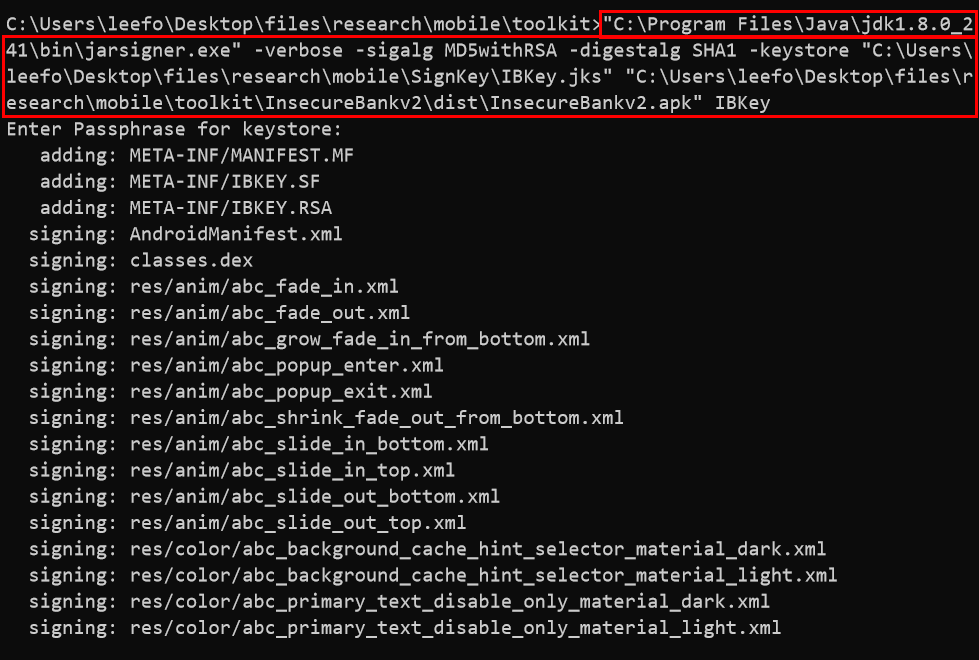 %JAVA_HOME%bin의 jarsigner을 사용해 아래와 같이 변조한 apk 파일에 서명을 해준다. 서명을 하기 위해선 키스토어 파일인 jks 파일이 필요하며 키스토어 파일 생성 시 썼던 인증서 이름?별칭?을 알고있어야 한다. 서명 방법은 링크를 참조했다.