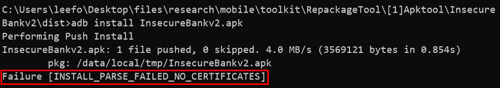 앱을 위변조한 후 무작정 다시 설치하려고 하면 아래와 같이 INSTALL_PARSE_FAILED_NO_CERTIFICATES 에러가 뜨게된다. 앱에 서명이 되어있지 않기 때문이다.