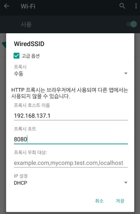 먼저, 프록시 설정부터 수행해준다. 녹스 에뮬레이터 기준으로 설정>WiFi 에서 WiredSSID 를 길게 클릭하면 아래와 같이 WiredSSID 네트워크 수정 창이 뜨게된다.