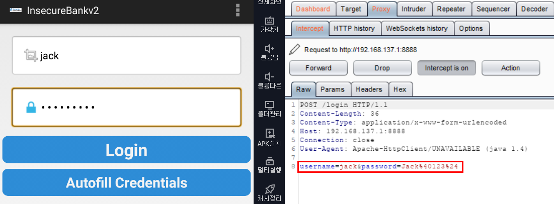버프스위트에서 Intercept is on을 클릭해준 후, 로그인을 수행해보면 HTTP 통신을 하고있기 때문에 아래와 같이 계정정보가 평문으로 그대로 노출되는 것을 볼 수 있다. 여담이지만 버프스위트 왜이렇게 저화질이지...? ㅇㅅㅇ??