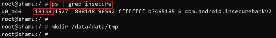 인시큐어뱅크(InsecureBankv2) 앱을 실행시킨 후 ps 명령어로 pid를 찾아준다. pid처럼 보이는 숫자 4개가 연속되어있는데 첫번째 값이 인시큐어뱅크 앱의 pid 값이다. 그리고 덤프 저장을 위해 /data/data에 tmp 폴더를 생성해주었다.