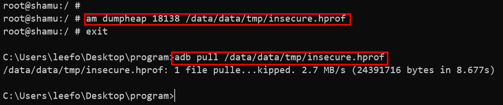 # am dumpheap 18138 /data/data/tmp/insecure.hprof