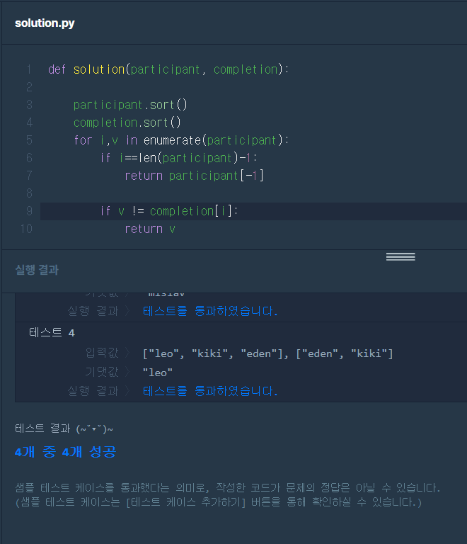 계속 participant를 돌며 completion에 일치하는 사람이 있으면 제외하는 방식보다는 애초에 처음에 sort를 해주었다. sort를 해주었으니 같은 인덱스의 participant 값과 completion의 값이 일치하지 않는다면 그 사람이 완주하지 못한 사람이 된다.