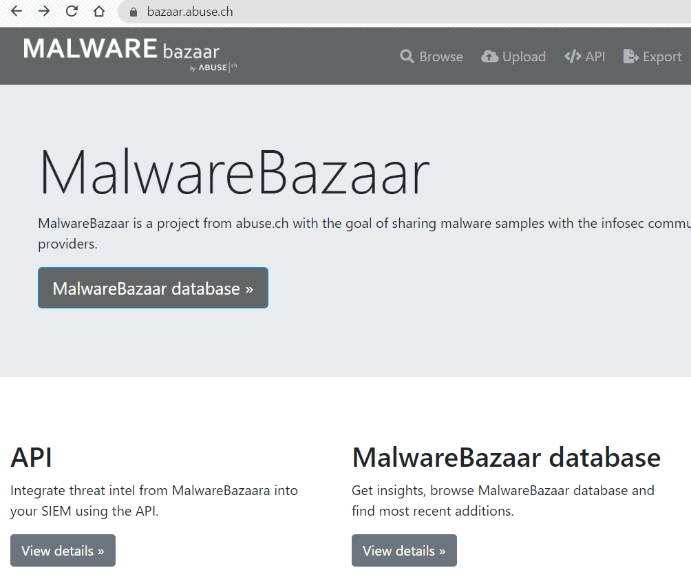 MalwareBazaar MalwareBazaar is a project from abuse.ch with the goal of sharing malware samples with the infosec community, AV vendors and threat intelligence providers. MalwareBazaar database »