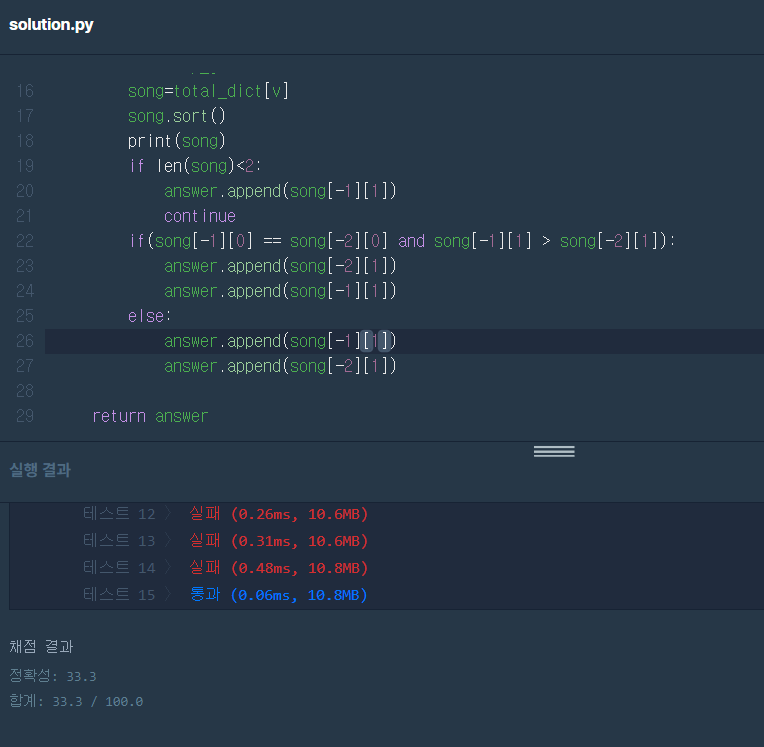예외처리도 전부 해주었는데 계속 아래처럼 채점결과가 33.3%가 나왔다. 도대체 뭐지 하면서 좀 삽질을 했는데 알고보니 나도모르게 top2의 곡을 뽑아야 한다는 것에 사로잡혀서 장르자체도 재생수가 높은순으로 top2를 뽑아놓는 방식으로 했다ㅋㅋ;
