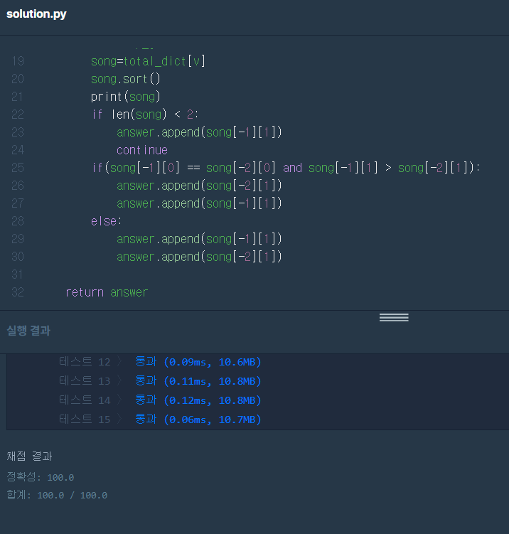 그리고 이 song 리스트에서 속한 노래가 2개가 안되는 경우와 재생수가 일치하는 곡의 경우 고유번호가 작은것을 먼저 추가하는 예외만 처리해주는 방식으로 코드를 작성했다.