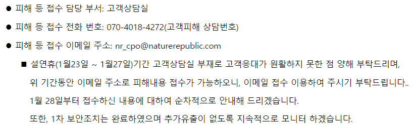 정리해보면, 해킹은 1월 15~16에 발생했고, 네이처리퍼블릭이 그 사실을 인지한 것이 약 일주일 후인 1월 22일이다. 이런 상황에 하필 23일부터 명절 연휴여서 즉각적인 피해 접수를 받지 못하였다.