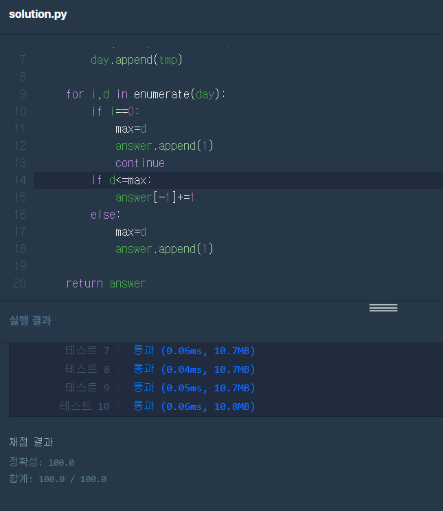 걸리는 시간을 전부 계산해놓은 day 리스트에 대해 반복문을 돌며 해당 값이 max 값인지, max보다 작거나 같은지를 확인하는 방식으로 리턴할 리스트의 요소 값을 추가하거나 이전 값에 +1을 해주거나 하는 방식을 사용했다. 초기값은 무조건 max이므로 max로 설정해주고 answer 리스트에 1을 추가해준다. day 리스트가 [7,7,9]라고 한다면 max값은 7이되고 answer 리스트는 [1]이 된다.