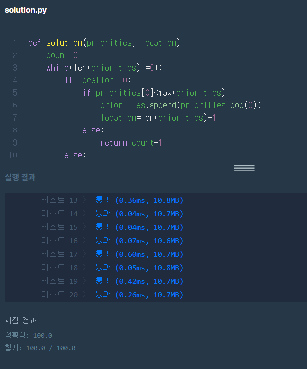 location=len(priorities)-1 #location을 맨끝으로 설정(배열길이-1)