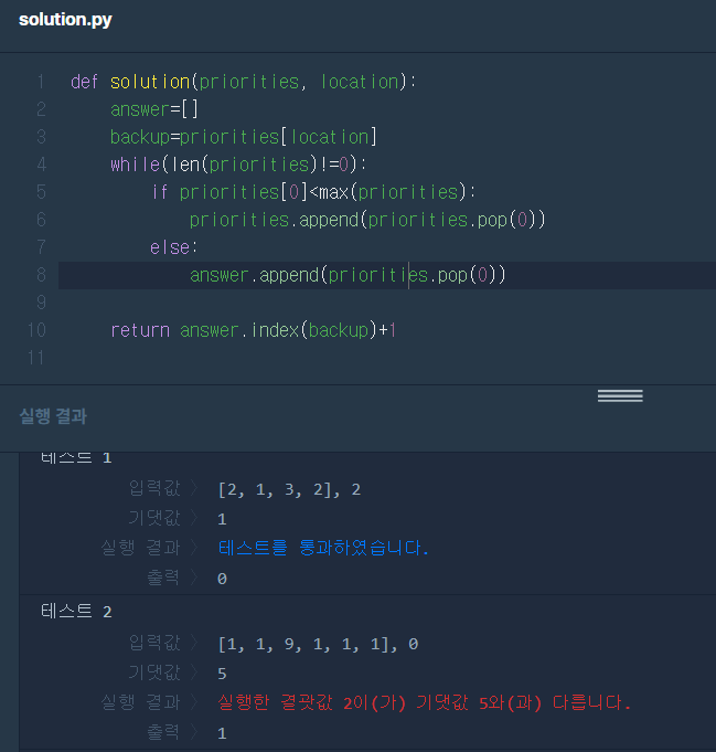 위 예시만 생각하고 처음엔 아래와 같이 코드를 작성했다. location에 해당하는 중요도 값을 backup에 담아두고 뽑히는 순서대로 추가한 ansewr 리스트에서 인덱스를 확인하는 방식이다.