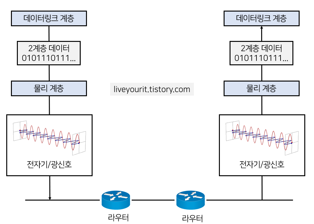 물리 계층은 디지털 데이터를 전기적 신호로 변환해 입출력을 담당하는 계층으로 전기적인 신호(비트열)만을 연결된 모든 노드에게 전달하는 계층이다.