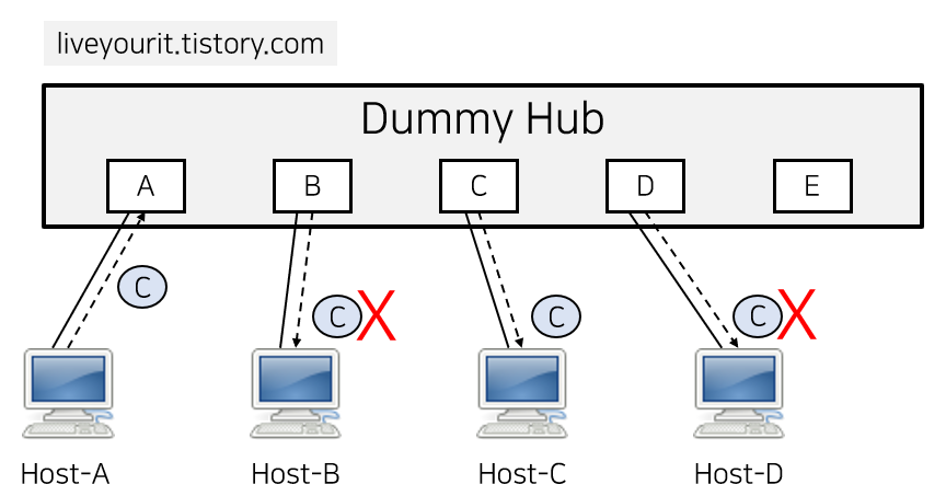 아래 그림에서 더미 허브의 동작 방식을 보면, Host-A에서 Host-C로 패킷 C를 보냈다고 했을 때, 연결된 모든 노드에게 해당 패킷이 전송된다. 그리고 Host-C를 제외한 나머지 호스트들은 자신에게 온 패킷이 아니므로 모두 폐기한다.