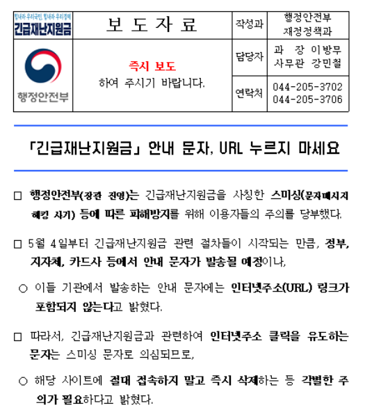 「긴급재난지원금」안내 문자, URL 누르지 마세요 | 행정안전부> 뉴스·소식> 보도자료> 보도자료
