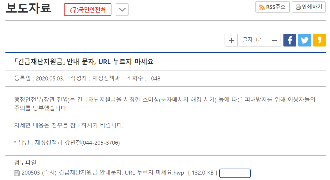 행정안전부, 긴급재난지원금 스미싱 관련 보도자료 배포