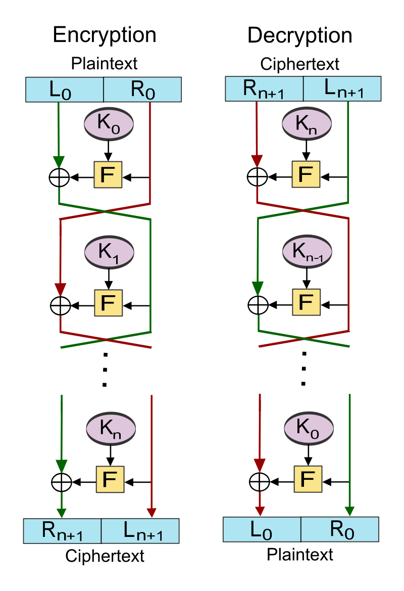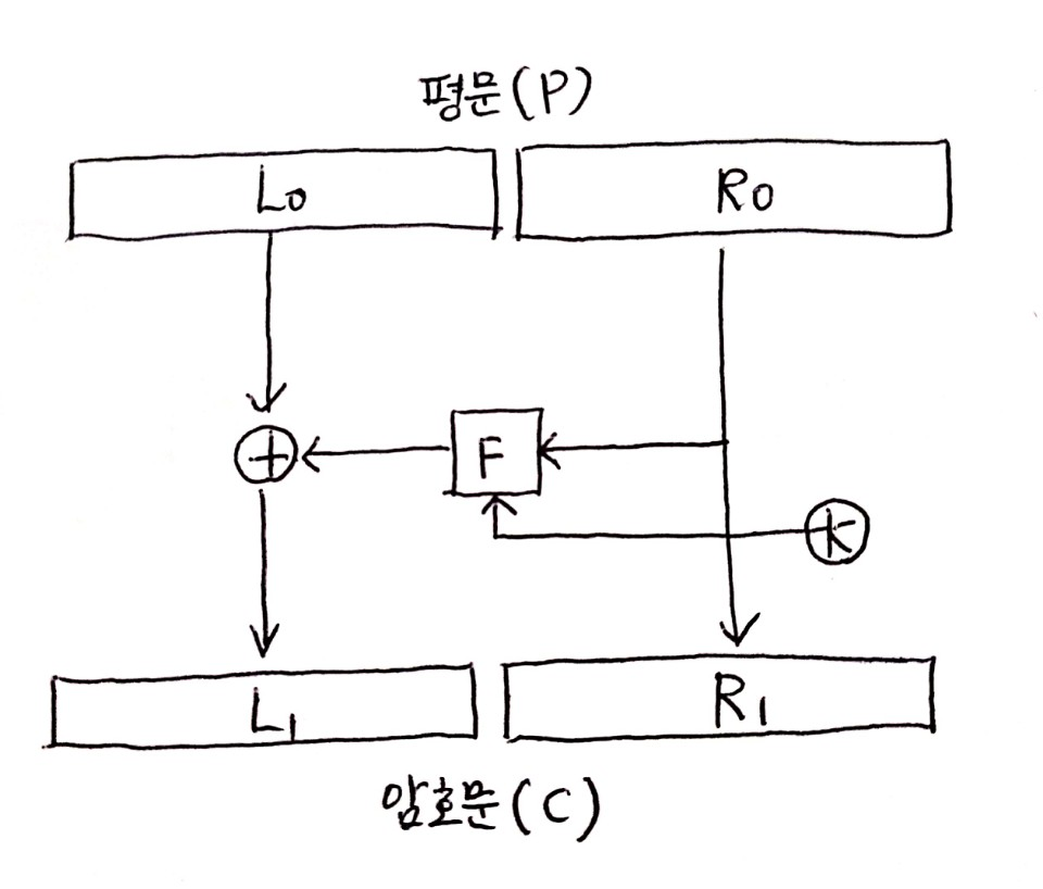 이를 일반화시켜보자. 암호화하려는 데이터를 반으로 쪼개 L0,R0이라 한다. 라운드 0,1,...,n에서 사용되는 키를 Ki, 라운드 함수를 F라 정의한다.