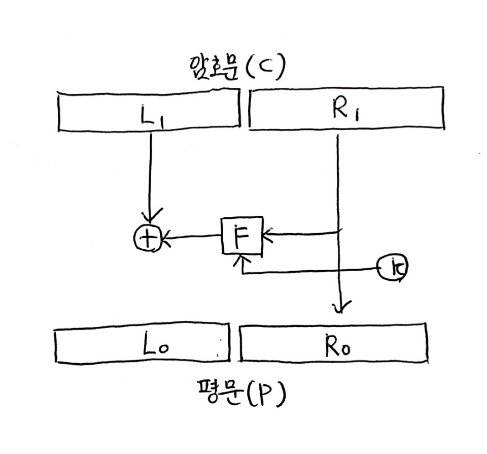 그리고 암호문 (Rn+1,Li+1)을 아래와 같이 복호화 시키면 평문값 (L0,R0)을 얻게 된다.