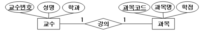 - ex. 한명의 교수는 한 과목만 강의, 한개의 과목은 한 교수에 의해서만 강의됨