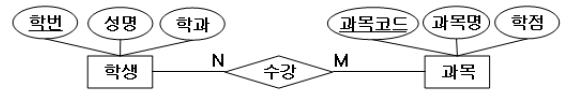 - ex. 한명의 학생은 여러 과목을 수강할 수 있고, 한개의 과목은 여러 학생에 의해 수강되어질 수 있음