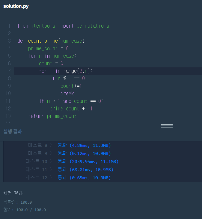 그리고 num_case에서 set을 사용해 중복을 제거한 후 소수 개수를 측정해주는 함수인 count_prime에 넘겨준다. count_prime에서는 2부터 n-1까지 나누면서 나누어떨어지는 것이 없는 경우 소수로 판단해 소수 리스트에 추가하고 개수를 리턴하게 하였다.