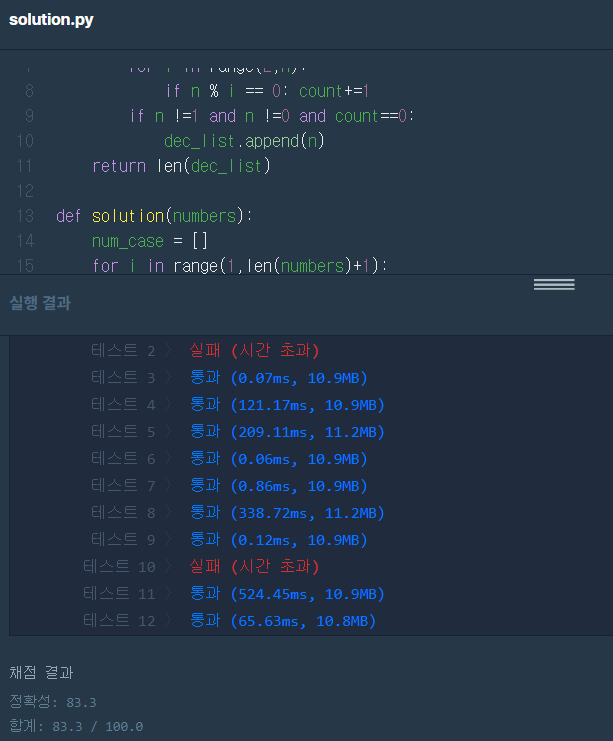 반복문 중에 시간을 줄일 수 있을만한 곳을 찾아보다가 아래 count_prime 함수에서 나누어떨어지는 경우 (=나머지가 0인 경우)에 대해 전부 count를 ++해주고 나중에 count가 0인지 확인하는 방식으로 하는게 굉장히 비효율적임을 알았다. 하나라도 나누어떨이지는 것이 있다면 소수가 아닌 것이기 때문에 그 다음 반복은 하지 않아도 되기 때문이다.