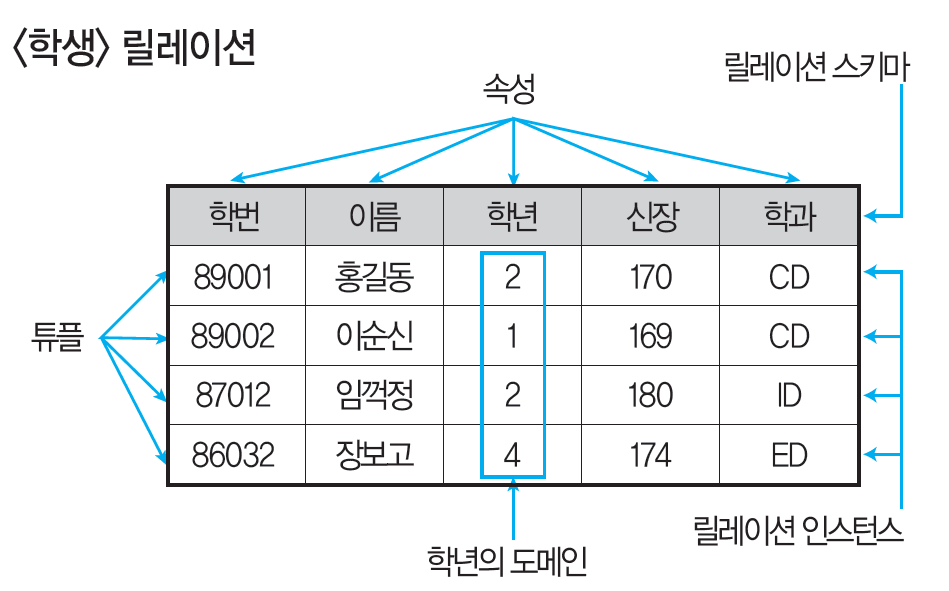 - 관계형 데이터베이스를 구성하는 개체나 관계를 모두 릴레이션이라는 표로 표현함