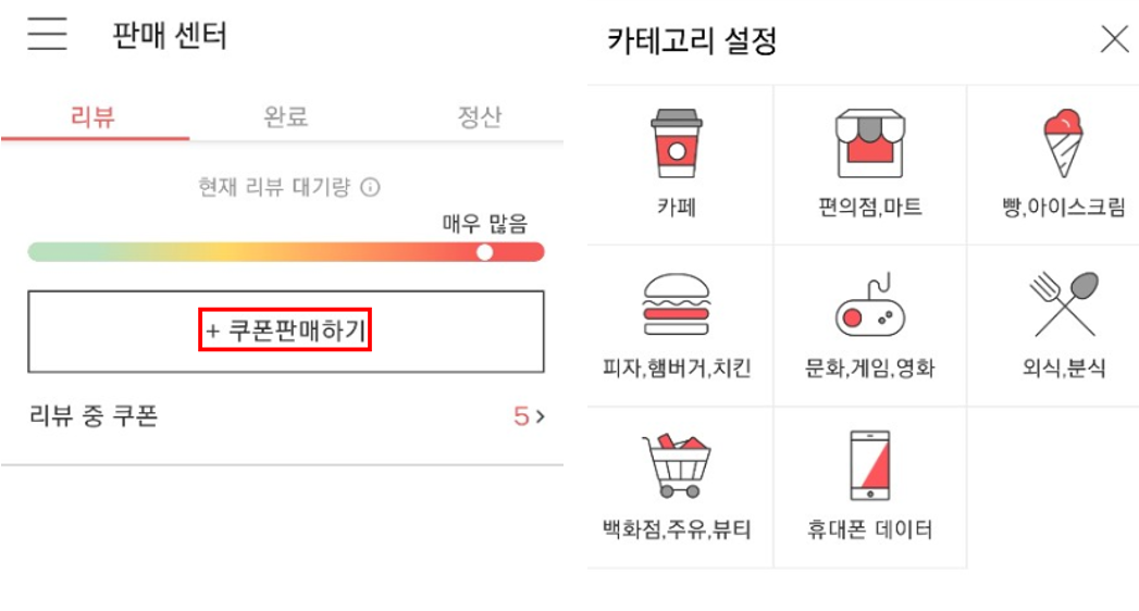 '+ 쿠폰판매하기'를 클릭하면 카테고리를 선택할 수 있다. 카테고리에는 카페, 편의점/마트, 빵/아이스크림, 피자/햄버거/치킨, 문화/게임/영화, 외식/분식, 백화점/주유/뷰티, 휴대폰데이터가 존재한다.