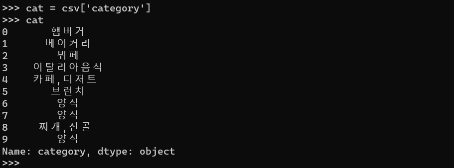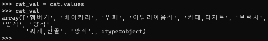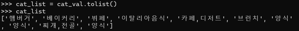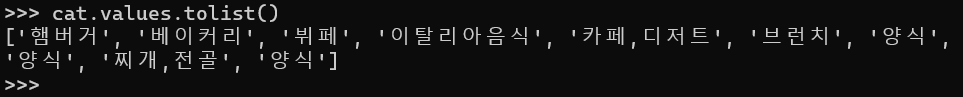 당연히, values와 tolist()를 합쳐서 cat.values.tolist()를 해줘도 된다.