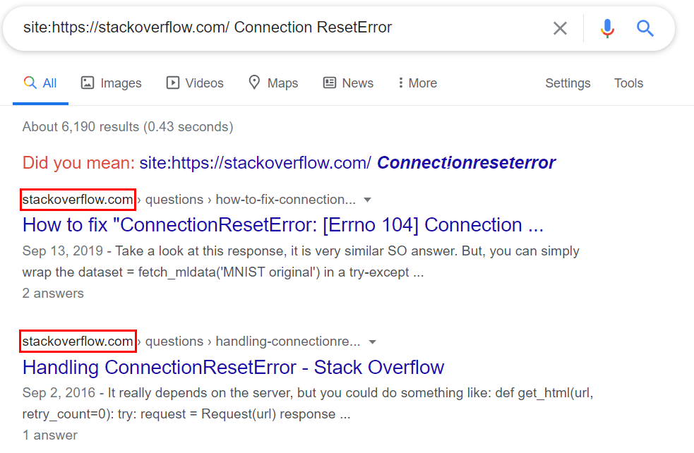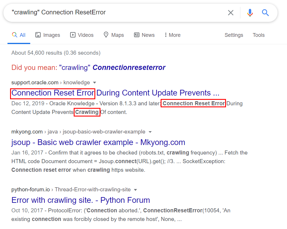 코딩을 하다가 에러가 발생하면 보통 구글링을 하게된다. 한 예로 크롤링을 하다가 Connection ResetError 에러가 발생했다고 가정해보자. 해당 에러에 대해 검색을 하는데 crawling이라는 단어가 꼭 포함됐으면 하는 경우, crawling을 ""로 감싸주면 된다.