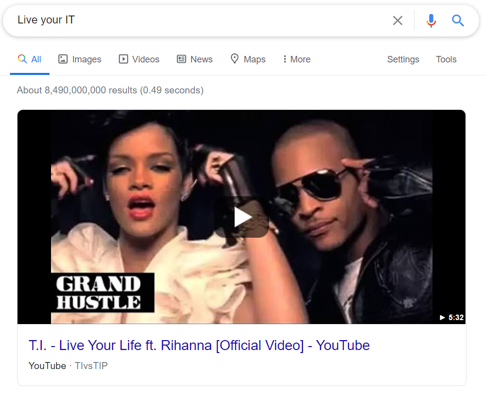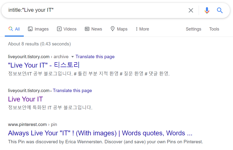 위에서 살펴본 ""는 제목 포함 내용에 특정 단어/문장을 포함시키는 것이었다면 intitle: 은 제목에 특정 단어/문장을 포함시키는 명령어이다. 예를 들어 내 블로그 이름은 "Live Your IT"를 검색해본다고 해보자. 구글에 그냥 검색하면 절대로 내 블로그를 찾을 수 없지만 intitle: 로 검색하면 바로 상위에 블로그가 검색되는 것을 확인할 수 있다.