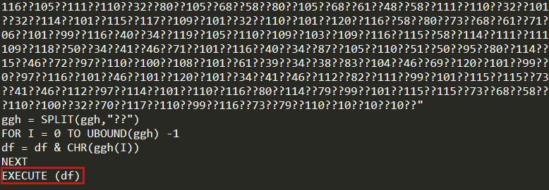 거의 똑같고, 그냥 변수이름만 바뀌었다. 이번에는 ggh에 난독화된 코드가 다시 들어가있다. 마지막에 EXECUTE(df)를 수행하기 때문에 해당 부분을 다시 Wscript.Echo(df)로 변경해보자.
