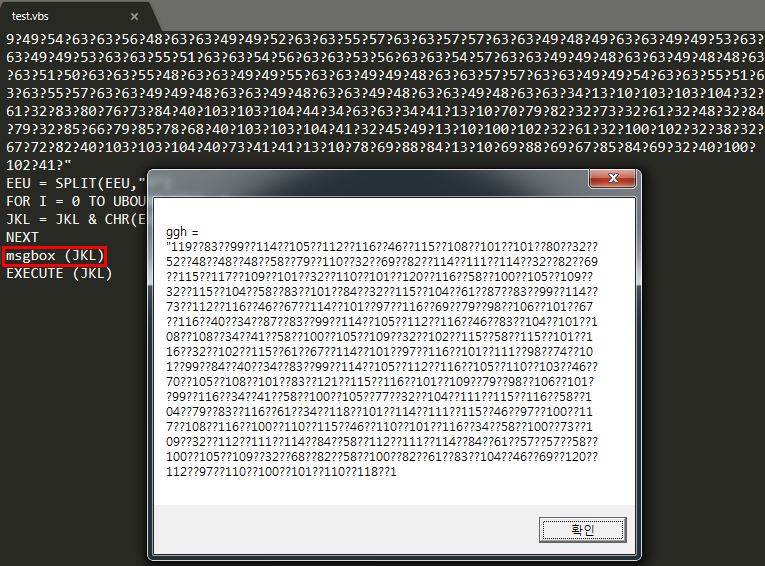 2번의 경우 다른 VBScript 악성코드 분석시 사용해보고 여기에 추가해보는 것으로 하고, 해당 악성코드의 경우 그리 복잡해보이지는 않으므로 여기서는 2번을 사용해보도록 한다. msgbox로 확인 시, 길이의 한계가 있어서 그런지 끝까지 확인을 할 수 없었다.