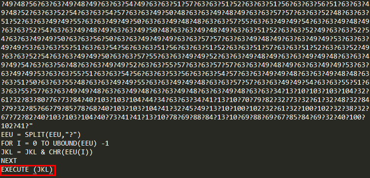 형태를 확인해보면, 위에 EEU 변수에 난독화된 코드가 들어가 있고, 마지막에 JKL을 EXECUTE하는 형태이다.