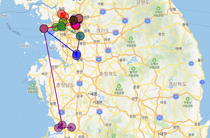 그리고 제일 중요한, 코로나 바이러스 확진자 각각의 이동 경로(동선)이 한눈에 보기 쉽게 표시되어 있다.