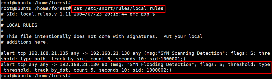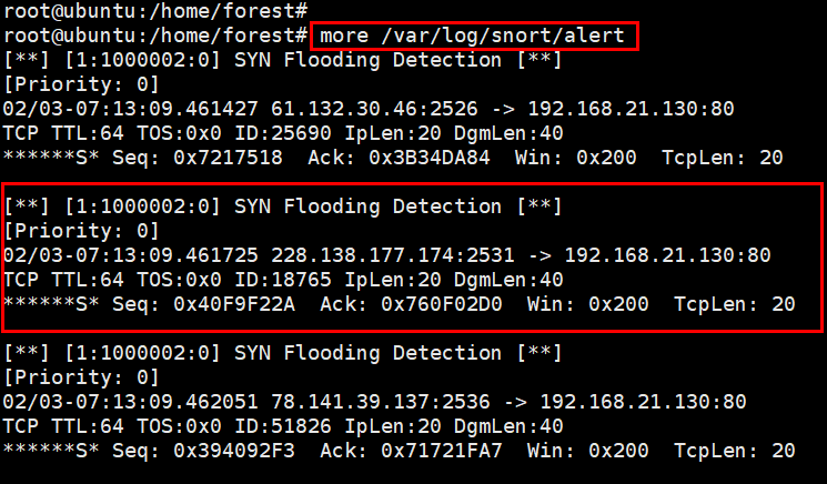 칼리리눅스(192.168.21.135)에서 TCP SYN Flooding 공격을 수행하고 우분투(162.168.21.130)에서 snort로 탐지를 수행한다.