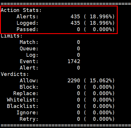 또한, snort 종료 후 'Action Stats'도 확인해 볼 수 있는데 alert, log 수가 기록되어있다.