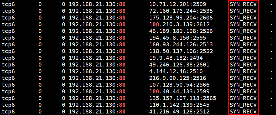 netstat 결과를 확인해보면, Souce IP가 전부 랜덤인 것과 소켓 상태가 전부 SYN_RECV인 것을 볼 수 있다. 즉, ACK를 받지 못해 아직 연결이 성립되지 못했고 SYN만 받아 대기큐가 차고 있다는 것을 의미한다.