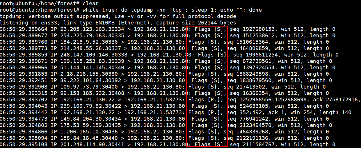 tcpdump 로도 확인을 해보자. SYN flag만 지속적으로 날아온 것을 볼 수 있다.