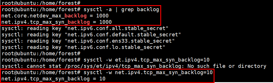 커널 파리미터 중에 백로그 큐 사이즈가 있고 이 값은 sysctl이라는 커널 변수값을 제어할 수 있는 명령어를 사용하여 임의로 설정해줄 수 있다. DDoS 공격을 바로 확인하기 위해 사이즈를 10으로 일단 줄여준다.