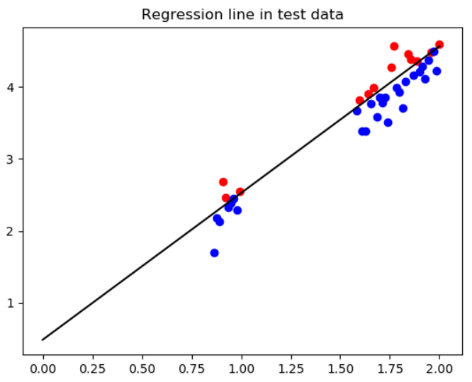 회귀선을 그리기 위해 x를 데이터가 존재하는 구간(0~2) 사이의 100개의 데이터로 선언해주고 y를 학습 데이터셋을 사용하여 학습한 결과로 나온 매개변수 coef와 intercept를 사용한 1차 방정식 식의 값으로 사용하였다.